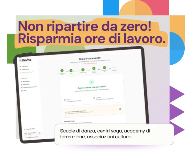 Scuole di danza, centri yoga, academy di formazione, associazioni culturali — se organizzi lo stesso evento periodicamente, tinvito.io ti fa risparmiare ore di lavoro ripetitivo.